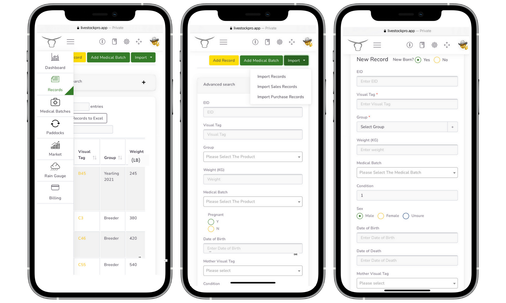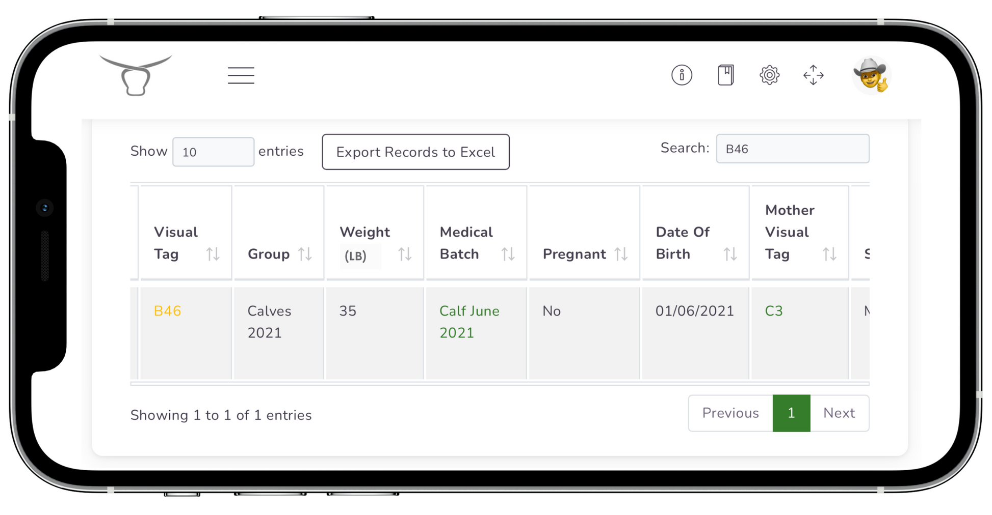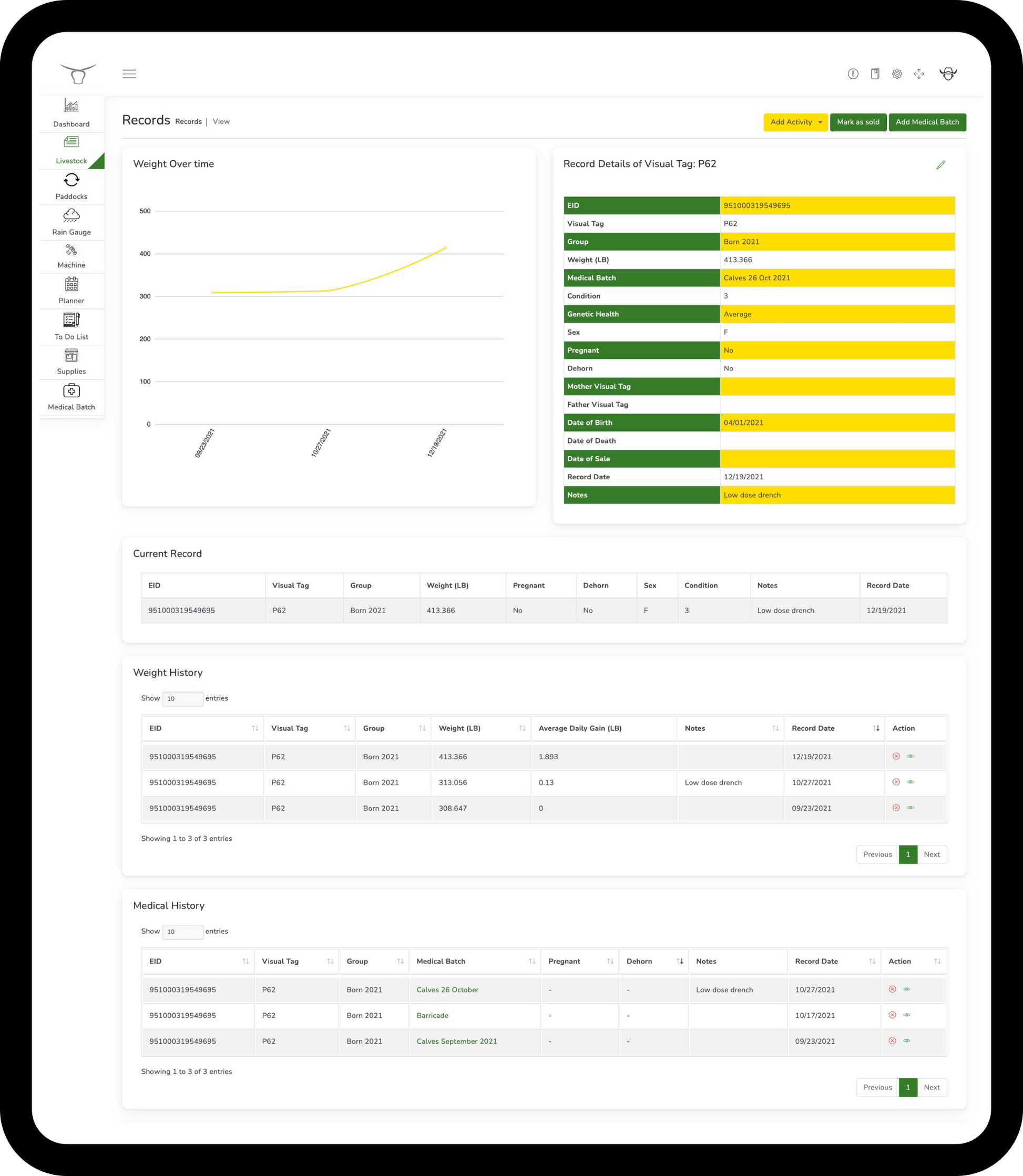 Individual animal records (displayed below) on an Apple or Android mobile device can be retrieved by this EID scanner simply by connecting the mobile device to the scanner via Bluetooth and then scanning the animals electronic ID tag. Medical and weight records can be quickly and easily added to the AgriEid software for powerful analytics and record keeping.